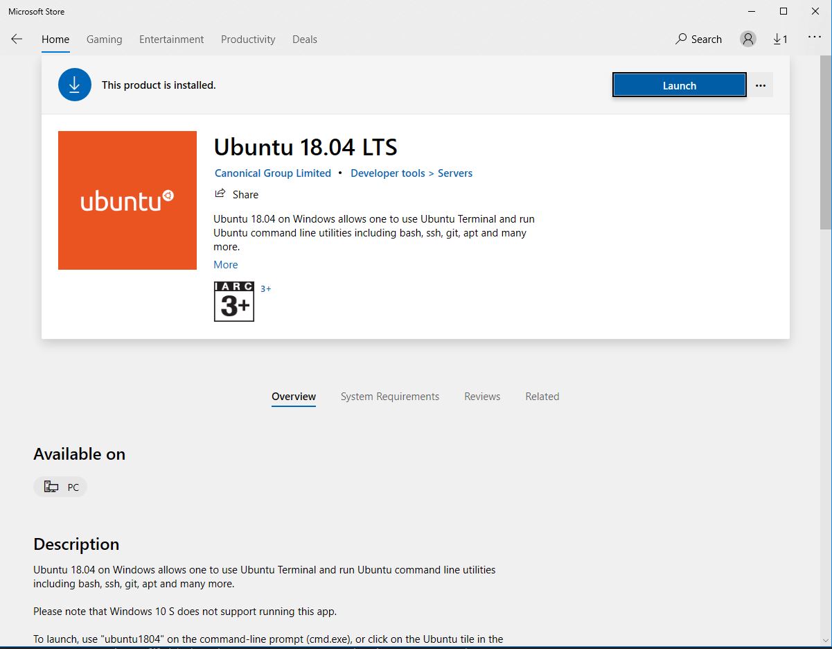 - Download A Linux distribution from the Microsoft Store , I have Ubuntu 18.04 already installed.