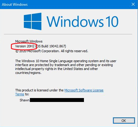 A window like this should appear, this shows my current Win10 version that is Version 20H2