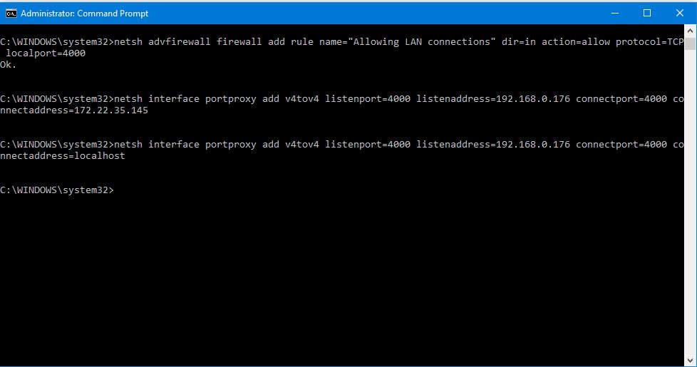 netsh interface portproxy add v4tov4 listenport=4000 listenaddress=192.168.0.176 connectport=4000 connectaddress=localhost