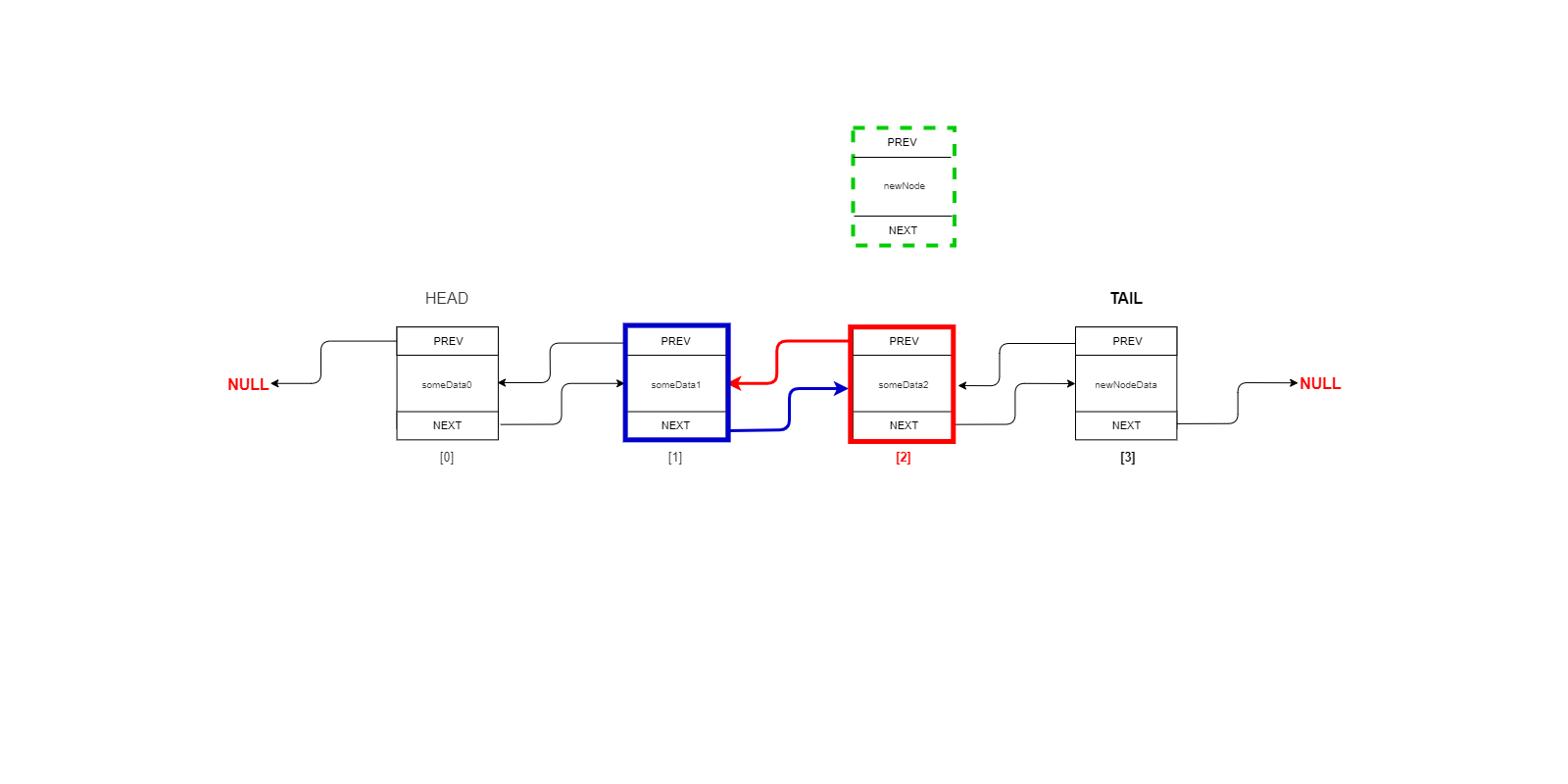 This completes our insertion of our new node in the head-to-tail direction since both our next links have been adjusted, but if the list were to be iterated tail-to-head, we would see problems, to fix this, we also adjust our previous links on the affected Nodes to reflect the changes, and increment the size by one.