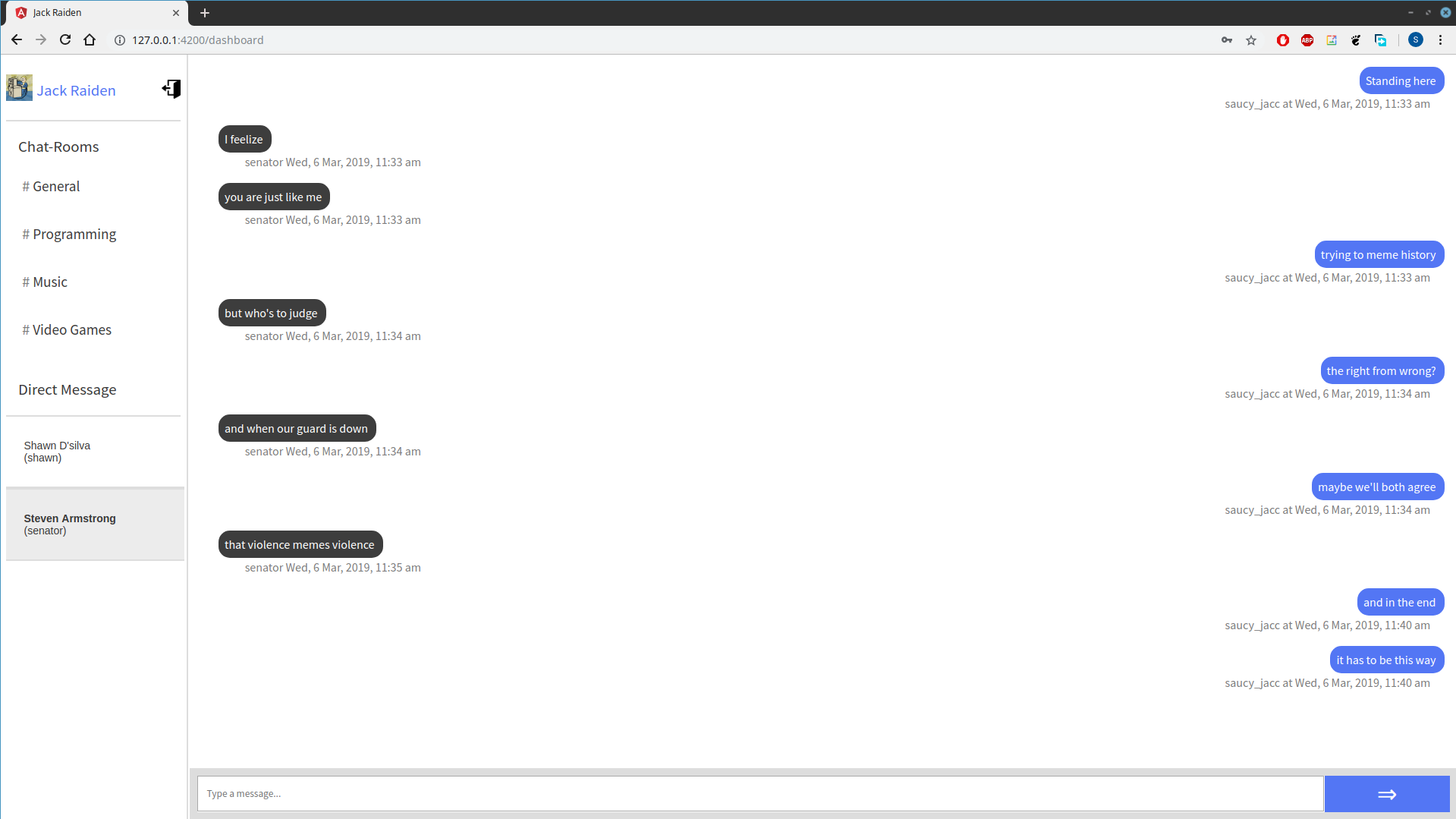 Features user to user direct messaging in realtime and JWT token based authentication.Uses Angular 2 for Single Page App functionality. Real Time chat functionality achieved using RxJs and socket.io