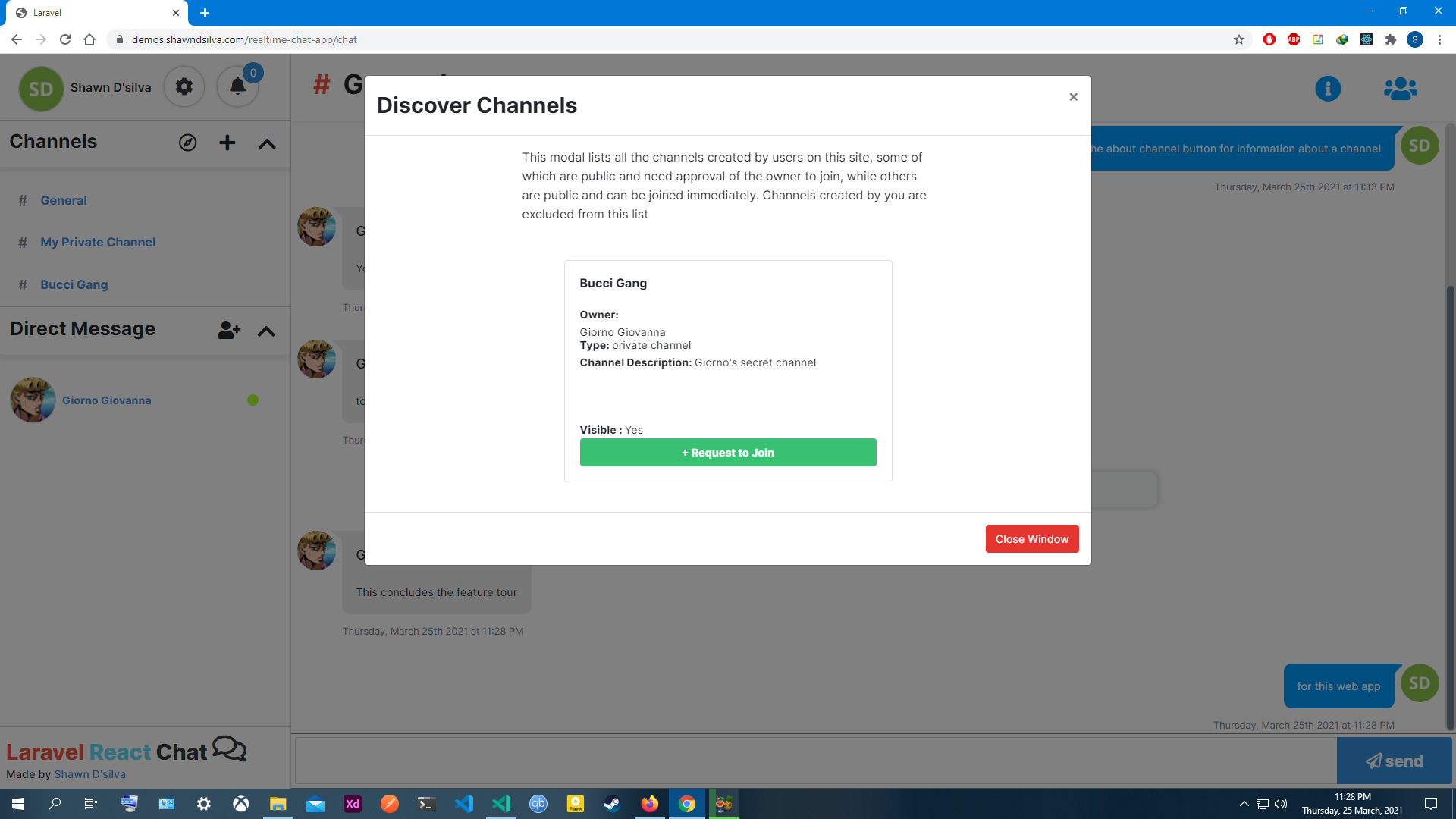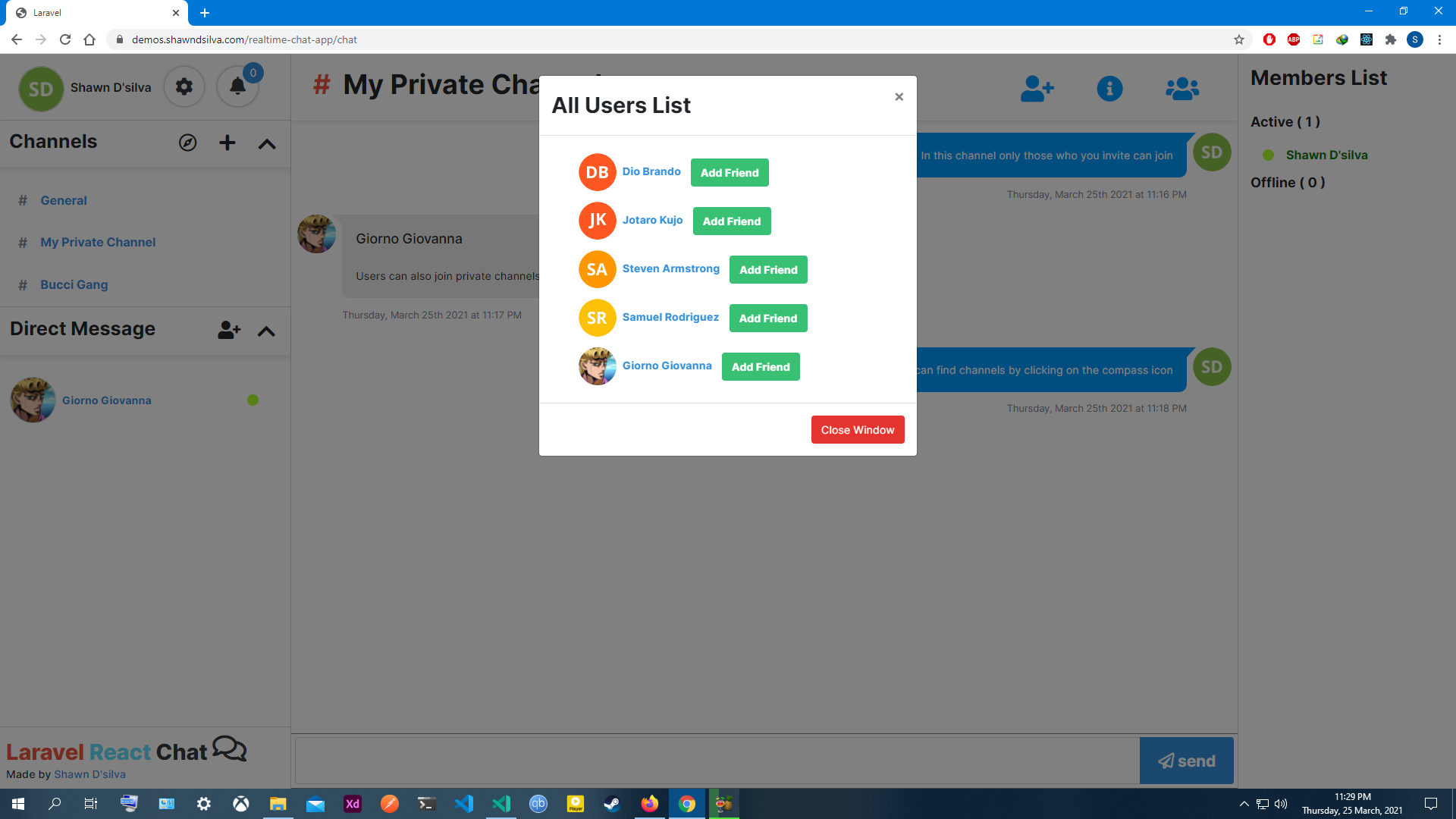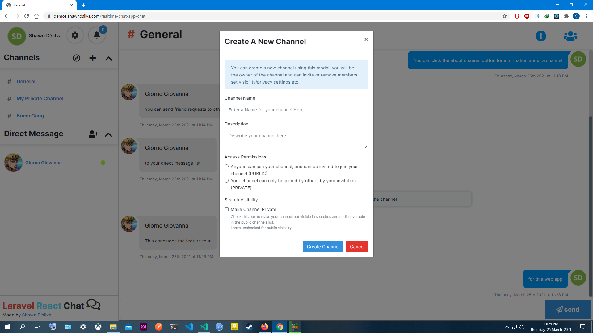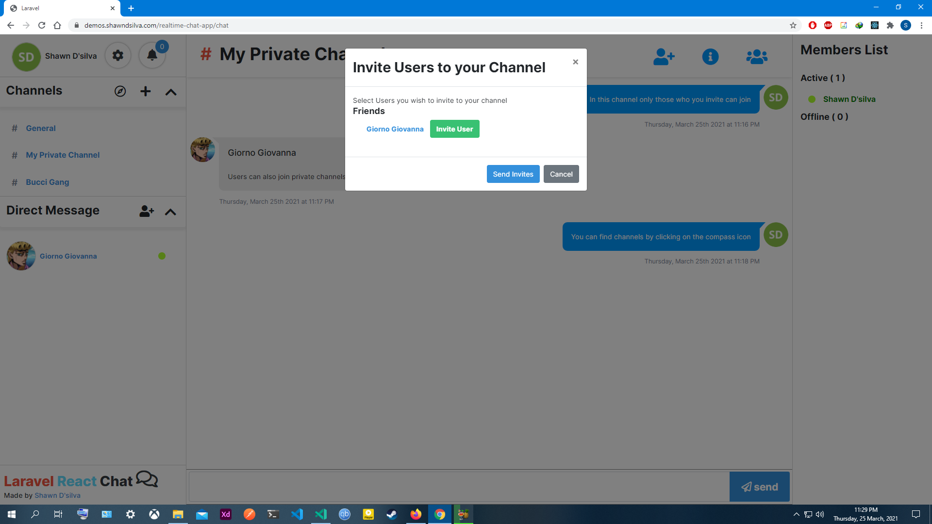 A Real Time Chat Web App made using React & Laravel, powered by WebSockets, with user to user private chats, channels for chatting between multiple users, notifications and a host of other features